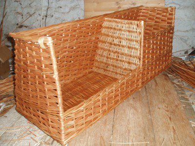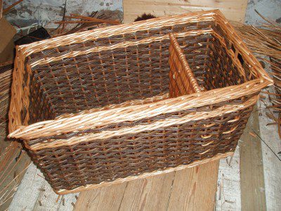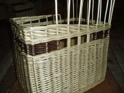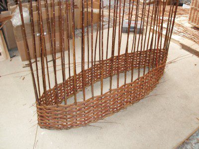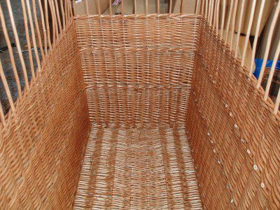 The following pictures show the making of a bespoke log basket with a divider. Handy for both kinding and logs. We used slewed weave and finish with a standard border. click on the first photograph for more information about each stage.