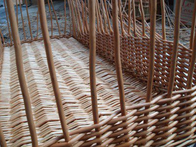 A beautiful white willow Moses basket in the making. To make the oval base we form a hoop, fix ‘uprights’ to one end and then weave across. After that the process is the same as on the rectangular basket – the uprights are inserted, the sides woven and the remaining uprights used to form the border. In this case we weave a plait border which is more decorative. Click on the first picture for more information about each stage.