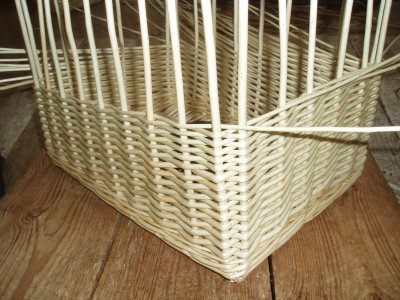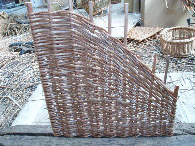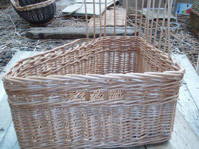 As long as the angle in the corner is 90 degrees it’s fairly easy to make a corner basket. Here made from buff willow using randed weave. Click on the first photograph for more information about each stage.
