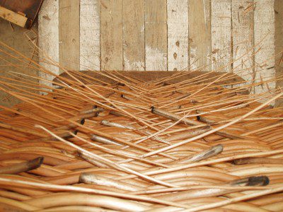 Below are series of photographs taken during the process of weaving some of the more unusual baskets we have the pleasure to make. Whether round or rectangular we always start with the base. Long uprights are then pushed into the base and bent upwards and the position fixed with a wale. This provides the framework for weaving. After this the sides are woven and finally the remaining lengths from the uprights are folded down and woven to form the border.