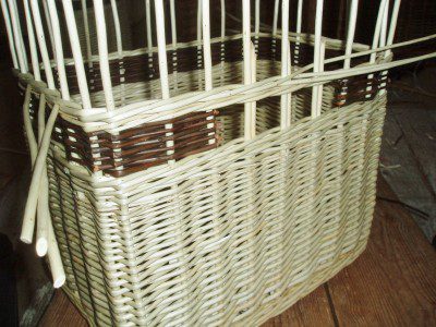 - The finished Moses Basket in white willow with plait border and carry handles.